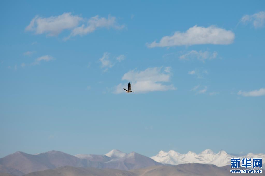 5月16日,在西藏仲巴縣裏孜口岸附近,一隻斑頭雁從(cong) 空中飛過。新華社記者 孫瑞博 攝