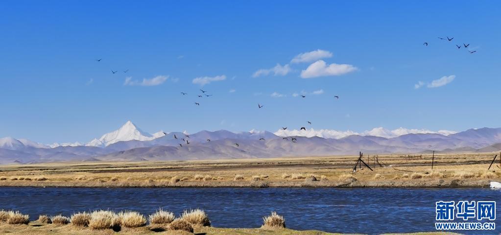 5月16日,在西藏仲巴縣裏孜口岸附近,一群斑頭雁飛翔在湖泊和雪山之間(手機照片)。新華社記者 沈虹冰 攝
