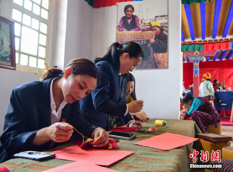 圖為(wei) 西藏自治區民辦職業(ye) 技能培訓學校行業(ye) 黨(dang) 員縫製黨(dang) 旗。貢嘎來鬆 攝