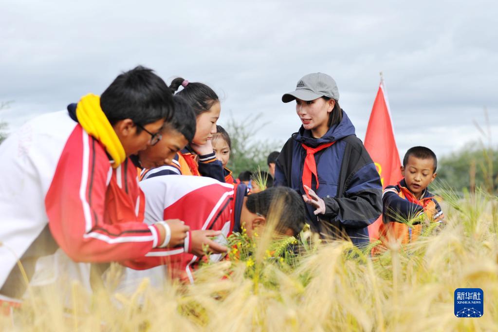 日喀則市上海實驗學校德育副校長潘傑和學生在青稞地裏交流(9月17日攝)。新華社發(施剛強 攝)