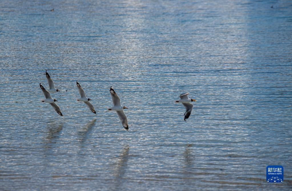 水鳥在羊卓雍錯湖麵滑翔(7月2日攝)。新華社記者 孫非 攝