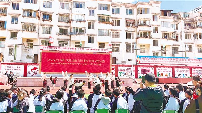 圖為(wei) 昌都市舉(ju) 辦戲曲進校園活動。本報記者 萬(wan) 慧 攝