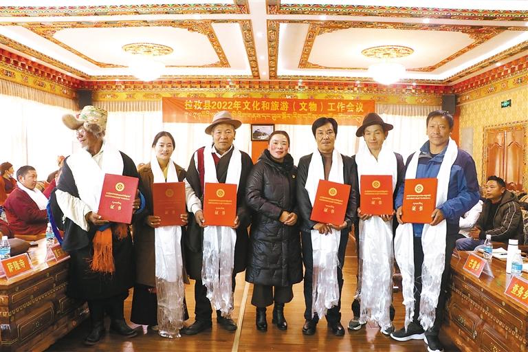 會(hui) 議總結了拉孜縣2021年度文化和旅遊(文物)相關(guan) 工作,向8家文化企業(ye) 發放了市級文化產(chan) 業(ye) 示範基地牌子;7支藏戲隊發放藏戲傳(chuan) 習(xi) 點牌子;30家文保單位發放了文保單位全景圖;8名非遺傳(chuan) 承人發放了非遺傳(chuan) 承人證書(shu) 。