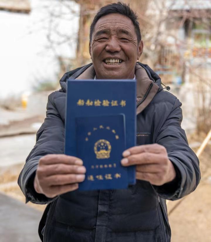 索朗紮西展示自己的船舶檢驗證書(shu) (2月23日攝)。新華社記者旦增尼瑪曲珠 攝
