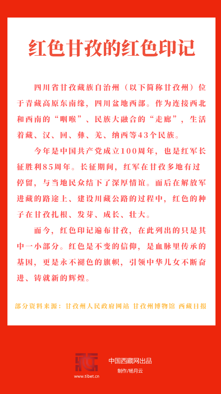 而今,紅色印記遍布甘孜,在此列出的隻是其中一小部分。紅色是不變的信仰,是血脈裏傳(chuan) 承的基因,更是永不褪色的旗幟,引領中華兒(er) 女不斷奮進、鑄就新的輝煌。