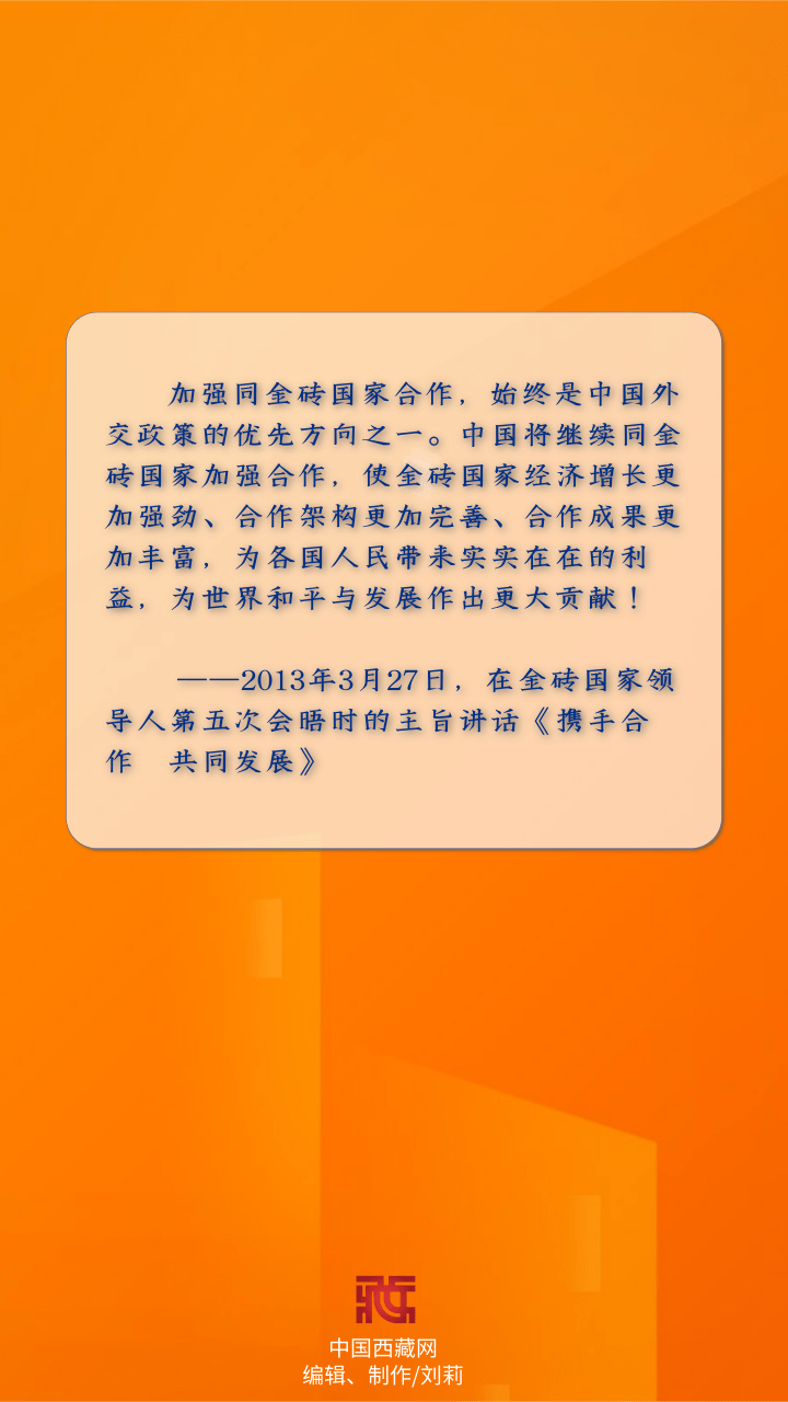 金磚國家包括中國、俄羅斯、巴西、印度、南非,都屬於(yu) 新興(xing) 經濟體(ti) 和發展中國家。國家主席習(xi) 近平十分重視金磚國家合作,一直親(qin) 力親(qin) 為(wei) 推動“金磚力量”不斷壯大。2013年3月27日,在金磚國家領導人第五次會(hui) 晤時的主旨講話《攜手合作 共同發展》中明確指出,加強同金磚國家合作,始終是中國外交政策的優(you) 先方向之一。