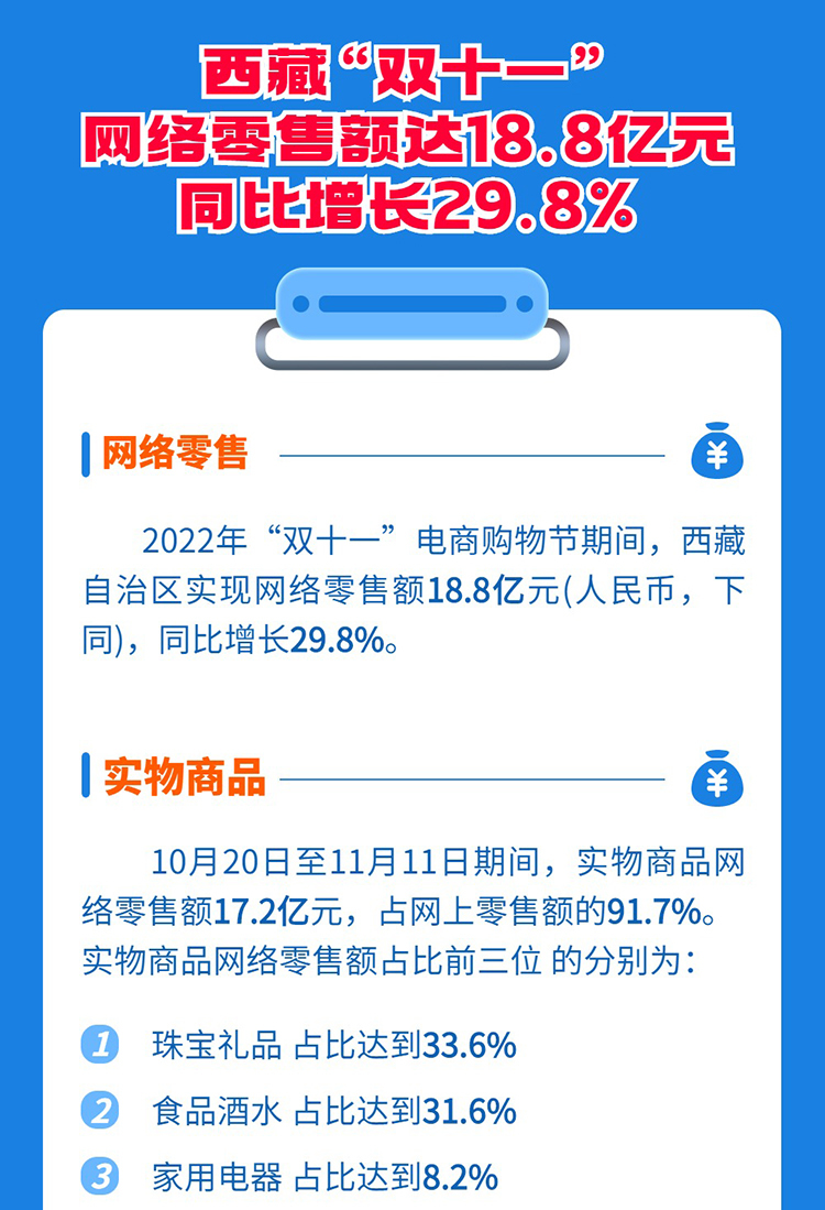 2022年“雙十一”電商購物節期間,西藏自治區實現網絡零售額18.8億元(人民幣,下同),同比增長29.8%。[詳細] -