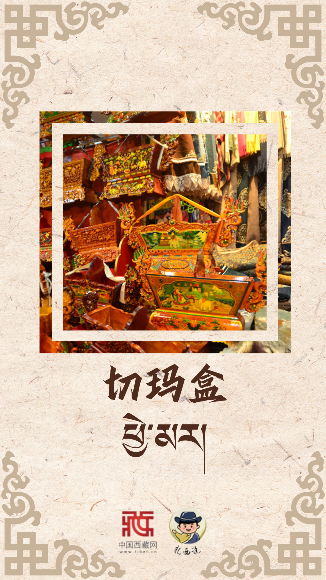 切瑪盒是歡度藏曆新年必不可少的吉祥物。它是底窄口寬的一個(ge) 長方形木質鬥,分為(wei) 兩(liang) 部分。左麵裝上麥粒,右邊裝上糌粑。然後,插上“孜珠”,即用酥油花裝飾的兩(liang) 個(ge) 木片,以及塗有黃色、綠色、紅色等幾種顏色的青稞麥穗,象征著人壽年豐(feng) 、吉祥如意。客人來拜年時,首先走到切瑪盒前,用拇指和食指捏少許炒麥粒、糌粑,向空中連拋三次,然後送入口中少許,再對主人說一聲:紮西德勒!