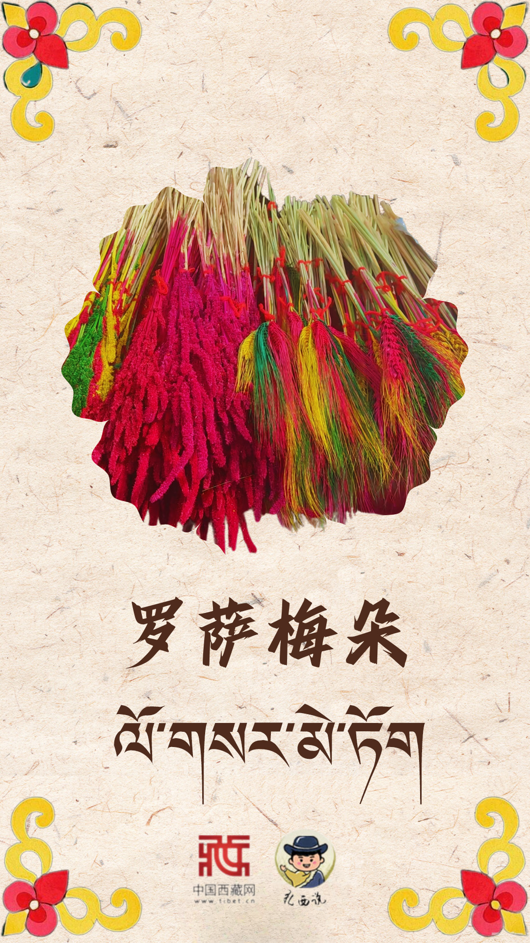 “羅薩梅朵”意為(wei) 新年花,是經過染色的麥穗和青稞穗花卉。每逢藏曆新年,家家戶戶的切瑪盒裏都要插上“羅薩梅朵”,祈願五穀豐(feng) 登,祝願家庭溫馨、美滿、幸福。