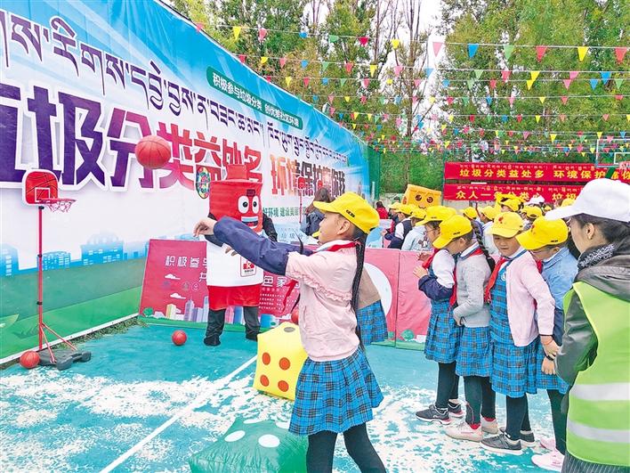 在拉薩市城關(guan) 區組織開展的“不忘初心、牢記使命”主題教育暨“垃圾分類黨(dang) 員先行 守護淨土人人有責”活動現場,學生代表參加趣味遊戲。