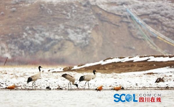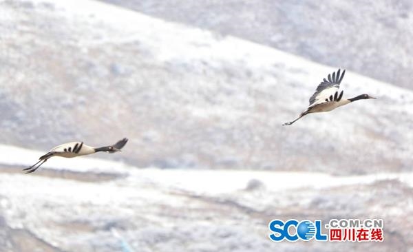 3月16日,在四川省阿壩州紅原縣安曲鎮的草原濕地,到處是雪茫茫的一片,從(cong) 雲(yun) 南、貴州等地越冬歸來的一群黑頸鶴在此嬉戲覓食。它們(men) 時而逐嬉鬧,時而展翅飛翔,與(yu) 周邊的犛牛、赤麻鴨相映成趣,給沉寂的高原帶來無限生機和活力。