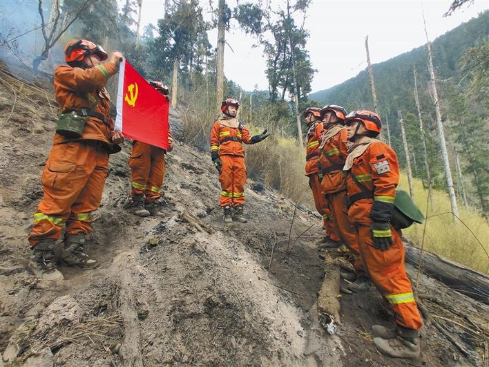 4月18日下午,米林縣森林消防中隊3名在火場中表現突出的消防隊員火線入黨(dang) 。曾小鋒 記者 王珊 張猛 攝