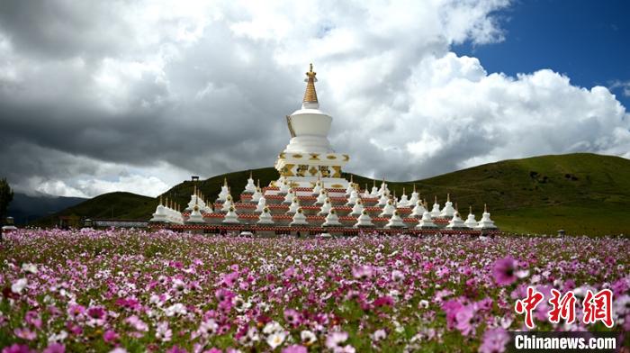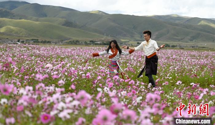 9月9日,四川稻城縣金珠濕地公園一望無際的格桑花海姹紫嫣紅,過往車輛和遊客們(men) 紛紛下車,走進濕地公園用手機直播和拍照留念。