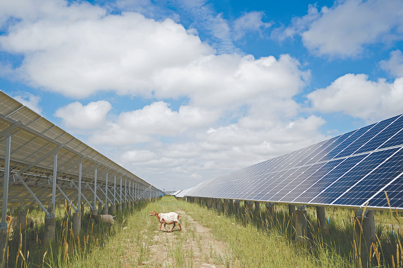 羊群在青海省海南藏族自治州共和縣塔拉灘的光伏發電基地休憩(8月5日攝)。邢廣利 攝