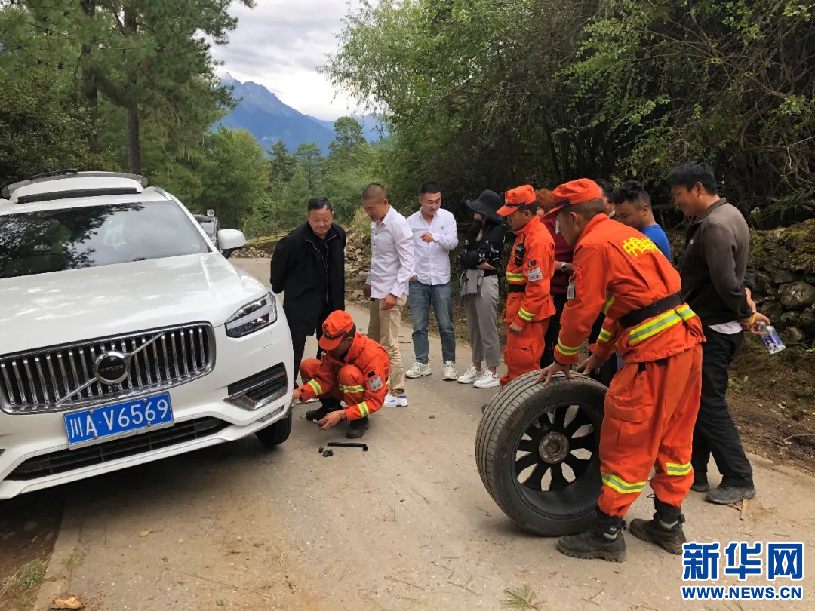 森林消防指戰員為(wei) 遊客換輪胎。新華社發(西藏森林消防總隊提供)