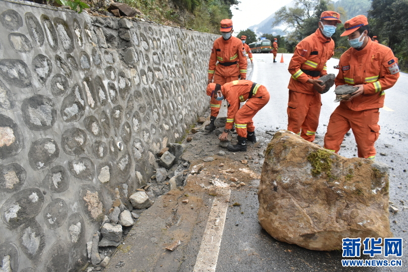 森林消防指戰員搬離滾石排除安全隱患。新華社發(西藏森林消防總隊提供)