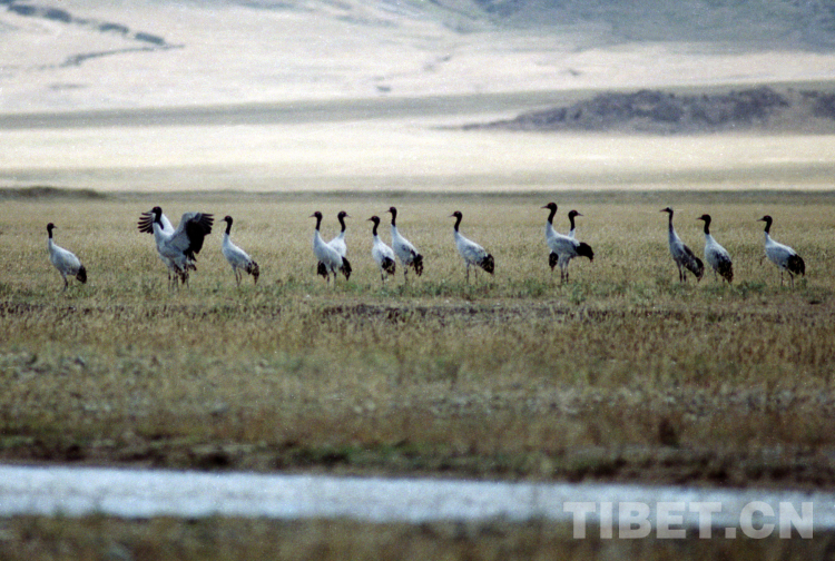 這是在藏北高原申紮縣濕地棲息的國家一級保護動物黑頸鶴(唐召明2001年攝)