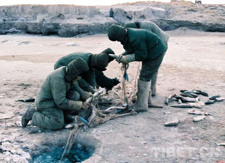 這是冬季在藏北無人區紮加藏布的破冰打魚人(唐召明1990年初攝)