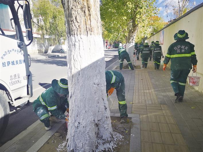 西藏拉薩市區近4萬棵樹木塗白換“冬裝”