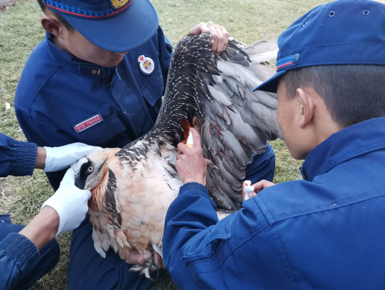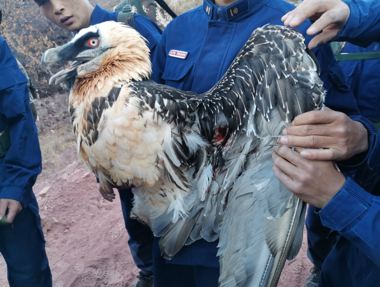 情況緊急,中隊指戰員立即將受傷(shang) 胡兀鷲帶回中隊,安排衛生員對其翅膀受傷(shang) 部位進行了診斷、清創、消毒、上藥等一係列外傷(shang) 緊急治療。並對其進行了強製性飲水、喂食,經中隊指戰員的精心照料和治療,胡兀鷲脫離了危險,於(yu) 11月20日上午與(yu) 卡若區林草局野生動物救助站交接,讓工作人員將它帶回進一步觀察治療,待它健康後放歸大自然。