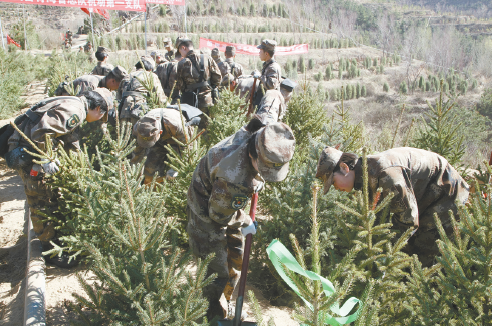 兵站部官兵進行參與(yu) 西寧南北山綠化