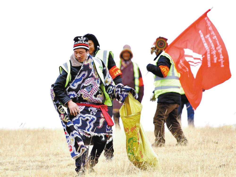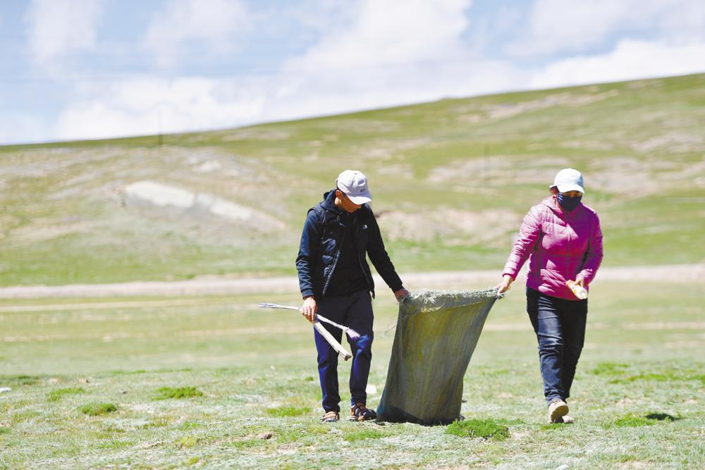 瑪多縣瑪查理鎮噶丹村,生態管護員索南吉(右)與(yu) 才讓多傑在村子周邊的草原上撿垃圾。