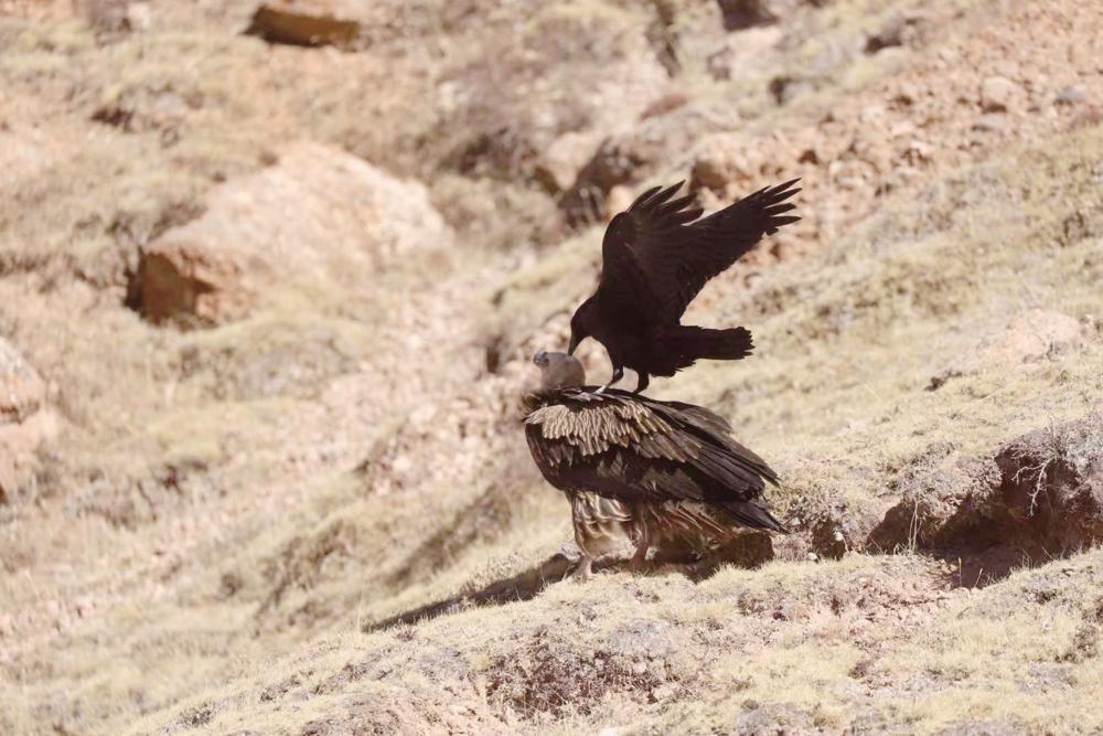 弱小的烏(wu) 鴉向猛禽禿鷲發起襲擊。曲麻萊縣生態環境和自然資源管理局供圖。