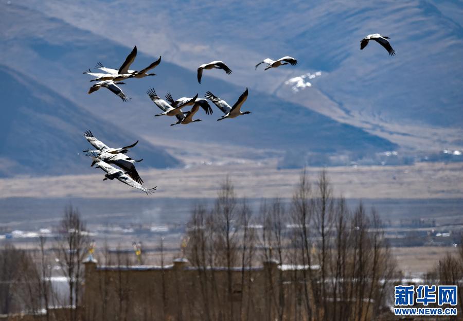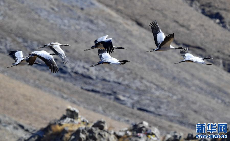黑頸鶴在林周縣黑頸鶴自然保護區上空飛翔(12月12日攝)。新華社記者 黃豁 攝