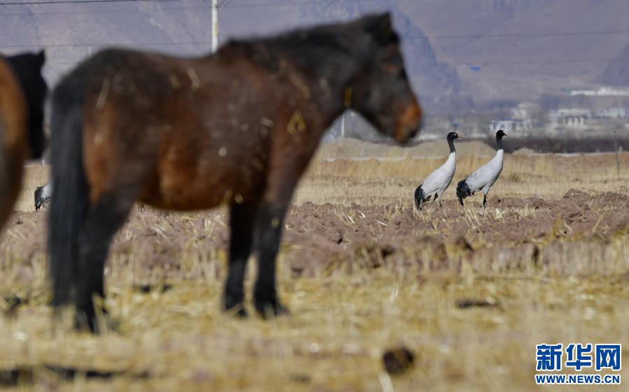 棲息在林周縣卡孜鄉(xiang) 農(nong) 田裏的黑頸鶴(12月12日攝)。新華社記者 張汝鋒 攝