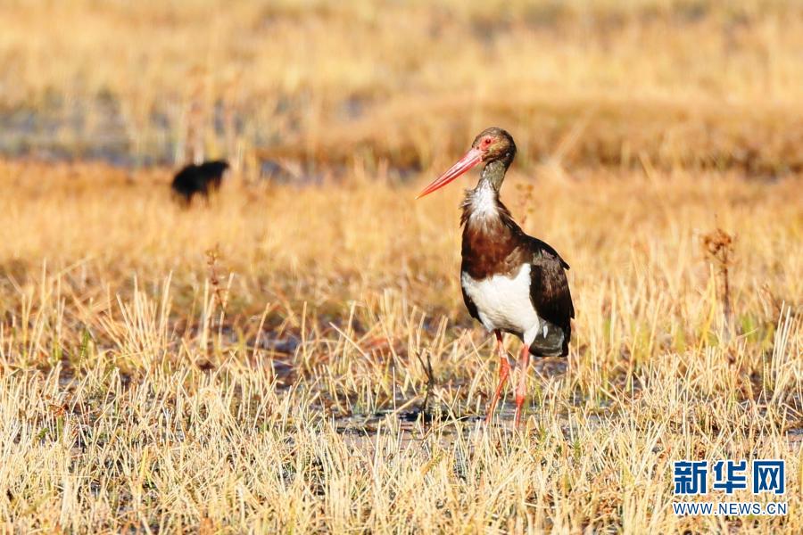這是11月20日在雲(yun) 南省香格裏拉市納帕海國際重要濕地拍攝的黑鸛。新華社 陳誌明 攝