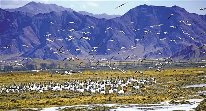 在冬日暖陽的照耀下,成群結隊的鳥兒在河麵上、濕地裏盡情嬉戲,赤麻鴨悠然戲水、斑頭雁低聲吟唱、黑頸鶴翩翩起舞……一派熱鬧的景象。[詳細] -
