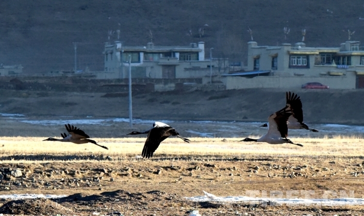 圖為(wei) 黑頸鶴在林周縣境內(nei) 飛翔 攝影:王媛媛