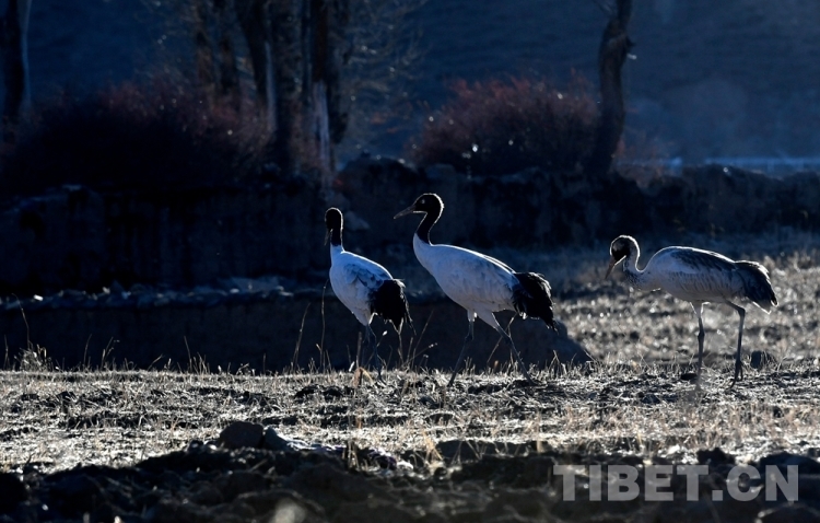 圖為(wei) 黑頸鶴在林周縣境內(nei) 的田野覓食 攝影:王媛媛