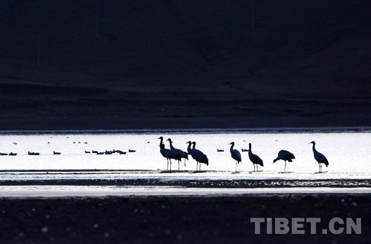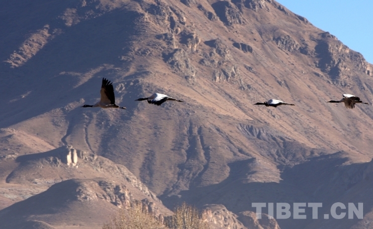 兩(liang) 麵夾山、背風向陽的虎頭山水庫,是候鳥的主要夜棲地。每年10月中旬開始,國家一級野生保護動物黑頸鶴便從(cong) 逐漸寒冷的藏北草原出發,成群結隊地飛越叢(cong) 山峻嶺遷徙到虎頭山水庫以及其所處的雅魯藏布江中遊河穀地帶越冬。