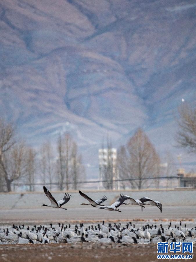 冬日,大批黑頸鶴在西藏拉薩市林周縣境內(nei) 棲息、覓食。 林周縣黑頸鶴自然保護區建立於(yu) 1993年,2003年被設立為(wei) 國家級自然保護區,是雅魯藏布江中遊自然保護區的核心部分,在每年的11月底至12月初,這裏便會(hui) 迎來成群的黑頸鶴過冬。