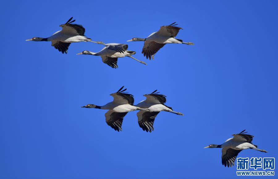 黑頸鶴在自然保護區裏飛翔(2021年1月3日攝)。新華社記者 張汝鋒 攝