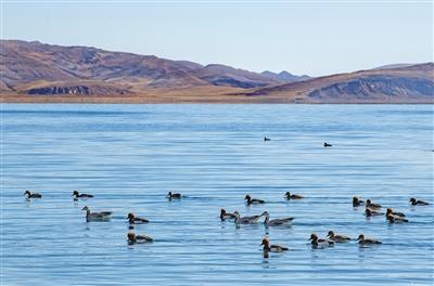羊卓雍錯自2014年被納入國家良好湖泊生態環境保護試點工程項目以來,羊卓雍錯周邊生態環境持續向好,棲息繁衍的野生動物數量逐年增多。這是近日拍攝的羊卓雍錯湖麵上的水鳥。新華社記者 孫非 攝