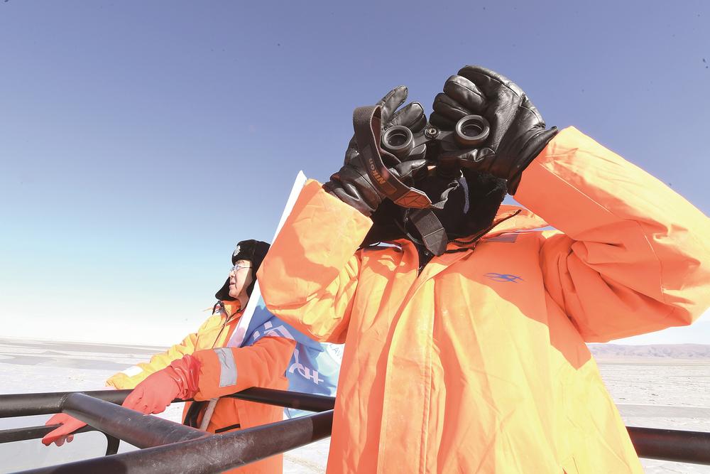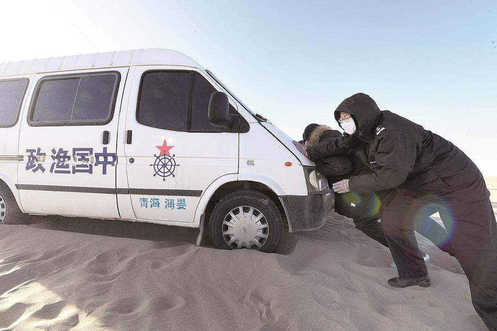 車緩緩駛向青海湖深處,即使穿得這麽(me) 厚實,但寒風襲來時,巡湖隊員們(men) 依舊被凍得直哆嗦。