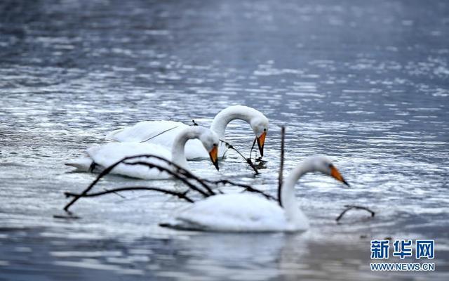 1月22日,大天鵝在青海省貴德縣境內(nei) 的黃河中覓食。新華社記者 張宏祥 攝
