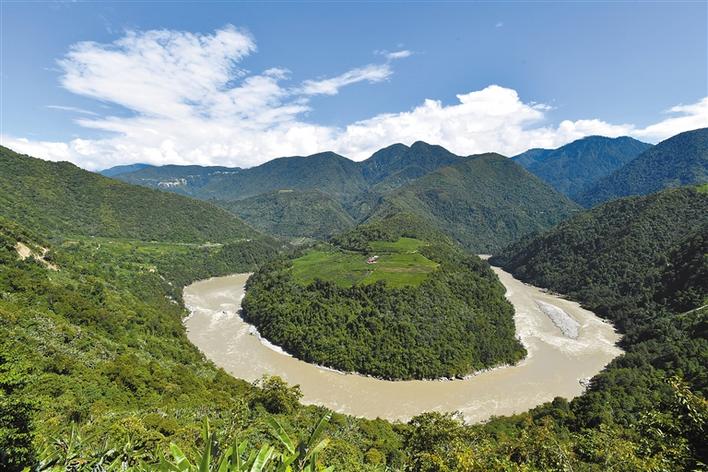圖為(wei) 西藏林芝市墨脫縣境內(nei) 的雅魯藏布江果果塘大拐彎。新華社記者 覺果 攝