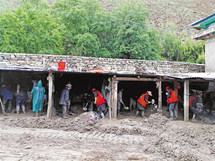 圖為(wei) 林芝市朗縣滾村“兩(liang) 委”、駐村工作隊組織村民開展清理淤泥活動。 史金茹 攝