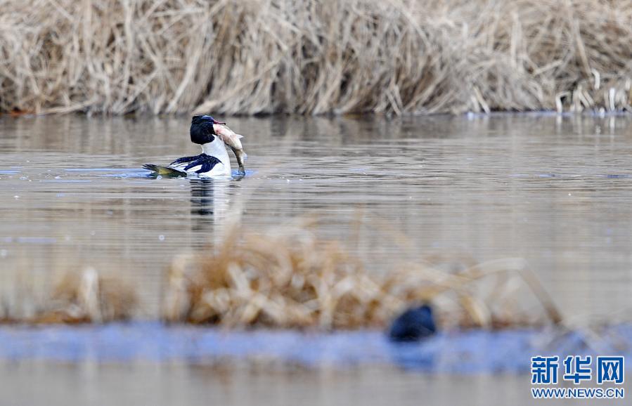 中華秋沙鴨在拉魯濕地的水麵上捕魚(3月7日攝)。新華社記者 張汝鋒 攝
