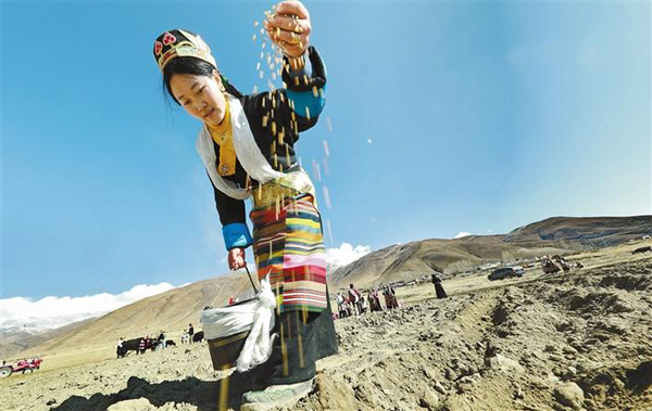 拉薩市墨竹工卡縣唐加鄉(xiang) 卓村四組群眾(zhong) 在田間撒下希望的種子。通訊員 洛桑克珠 記者 洛桑 攝