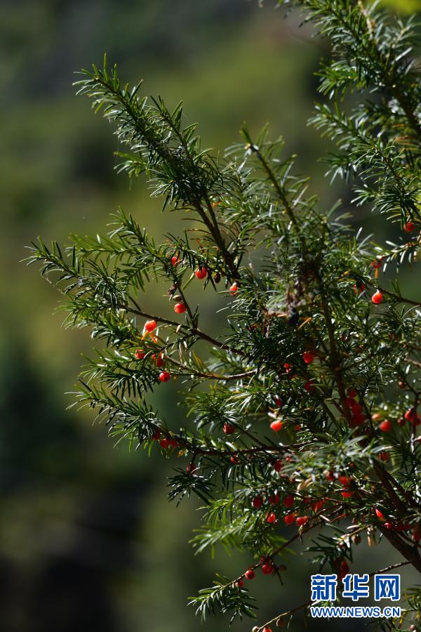 這是科研人員在西藏定日縣絨轄溝發現的密葉紅豆杉(2020年10月27日攝)。新華社發 趙明旭 攝