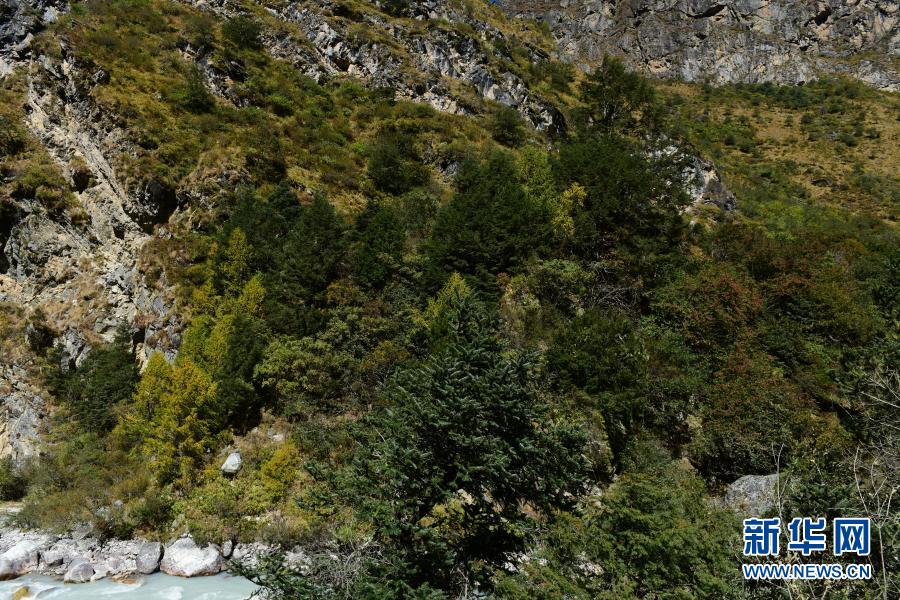 這是西藏定日縣絨轄溝內(nei) 一片含有密葉紅豆杉的植物群落(2020年10月29日攝)。新華社發 趙明旭 攝