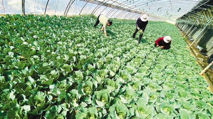曲水縣聶當鄉(xiang) 當地農(nong) 民為(wei) 溫室大棚內(nei) 種植的蔬菜除草。