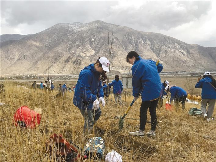 圖為(wei) 青年誌願者在拉薩市堆龍德慶區“西藏青年誌願者林”義(yi) 務植樹。次仁羅布 李洲 攝