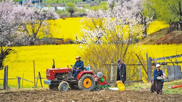 日前,林芝市巴宜區布久鄉(xiang) 朵當村群眾(zhong) 駕駛農(nong) 用機械犁地,與(yu) 遠處桃花和油菜花構成一幅秀美田園風光圖。