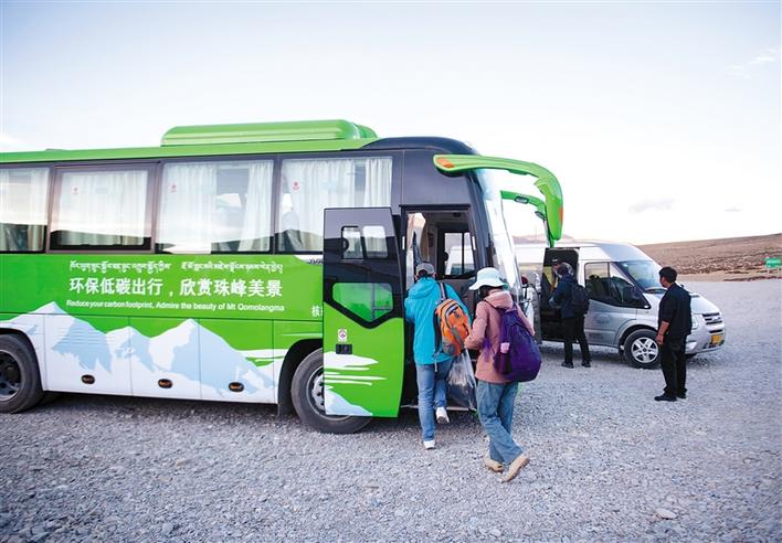 遊客在珠穆朗瑪峰景區停車場轉乘環保客車(2019年5月16日攝)。珠穆朗瑪峰景區內(nei) 自2019年5月開始試運營清潔能源環保客車,以進一步平衡珠峰地區旅遊發展與(yu) 環境保護需要。新華社記者 孫非 攝