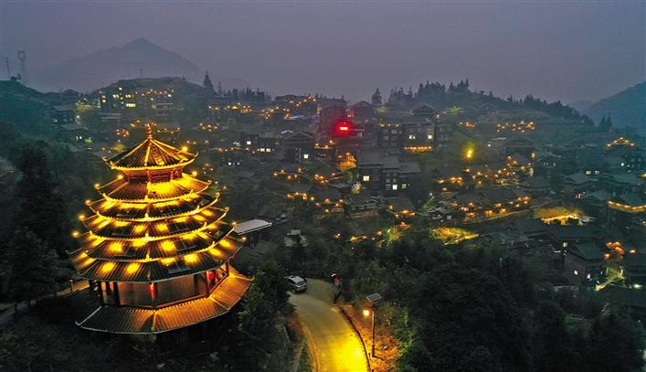 在廣西柳州市三江侗族自治縣八江鎮布央村,太陽能路燈和鼓樓上的太陽能裝飾燈讓鄉(xiang) 村的夜晚亮了起來(2020年12月28日攝,無人機照片)。 新華社發 (黎寒池 攝)